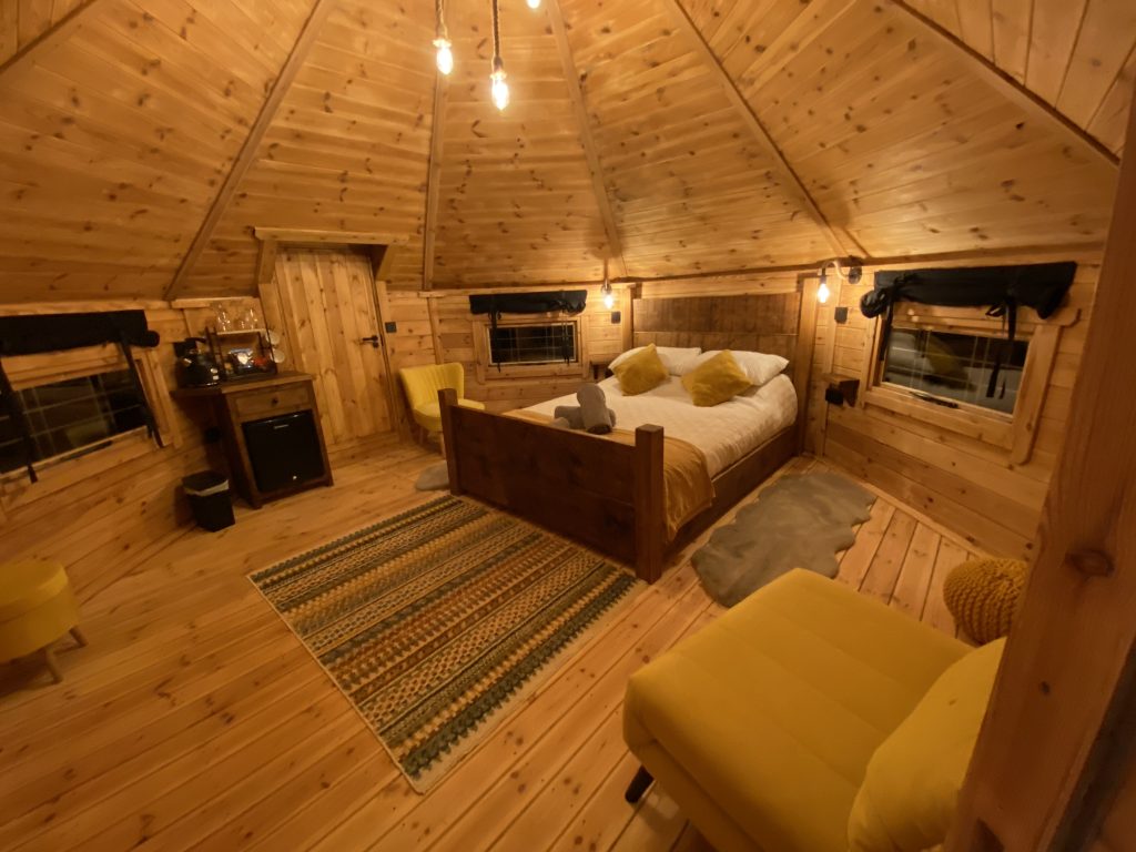 Our cosy cabin can sleep a maximum of 3 guests with a yellow theme. With a large king size bed and 1 single sofa bed