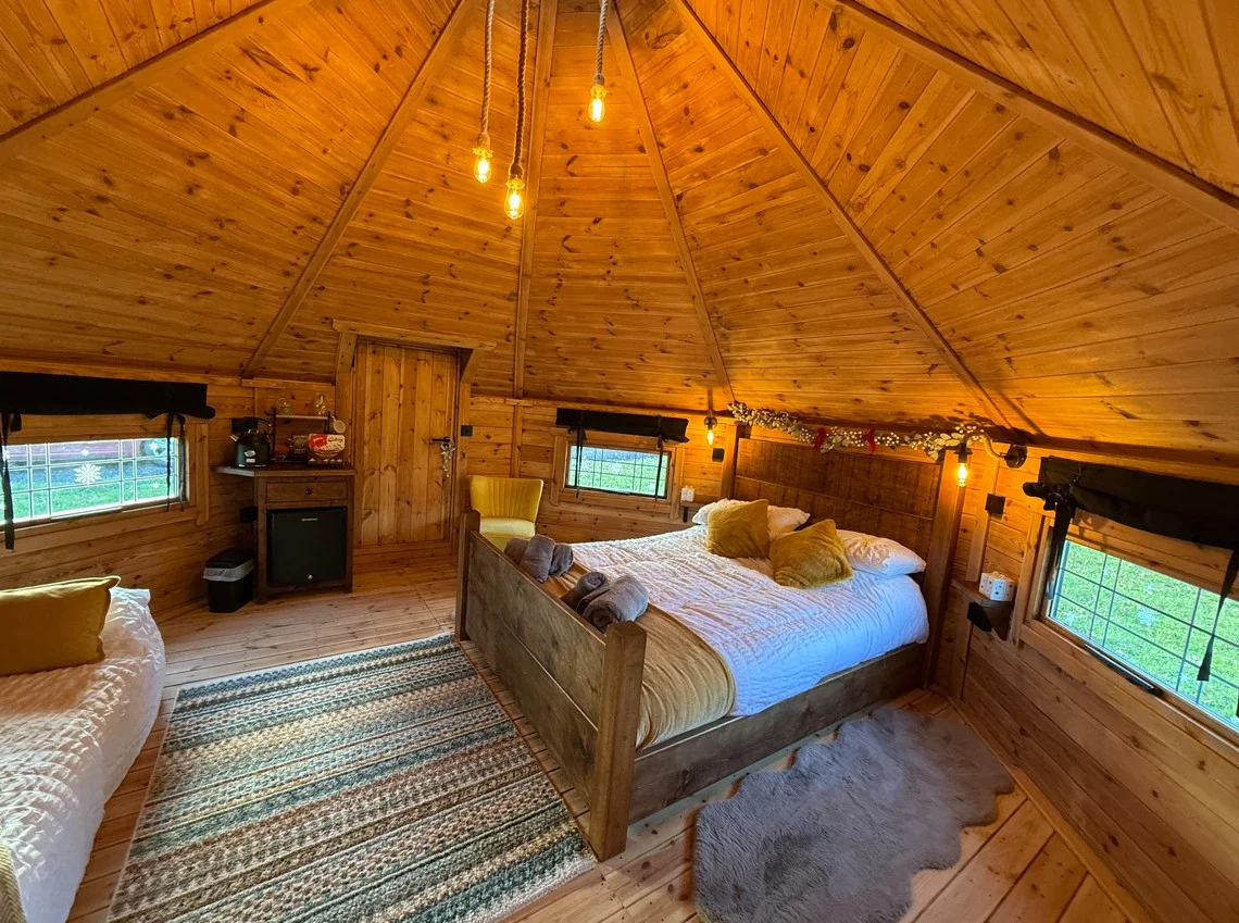 Our Cosy Cabin has the additional feature of an enclosed porch perfect for coming in out of the weather. This cabin has more of an intimate feeling by allowing a maximum of three guests with a handmade chunky king size bed and comfy bedding plus a sofa bed for the additional guest. Warm, intimate, and delightfully quirky, it's designed to offer a snug retreat with plenty of character — perfect for unwinding and enjoying a charming little escape.